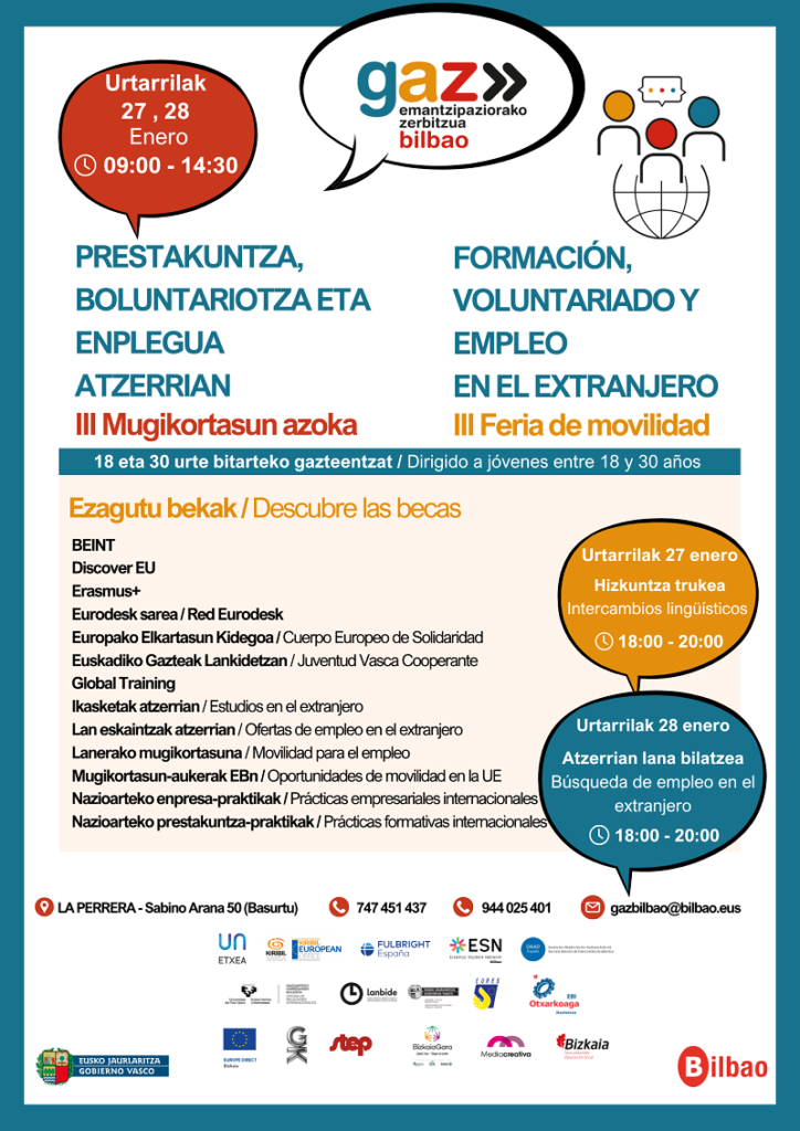 El pasado 27 y 28 de enero tuvimos el placer de asistir a la III Feria de Movilidad: formación, voluntariado y empleo en el extranjero organizado por GAZBilbao, un espacio donde compartimos nuestros proyectos Erasmus+.